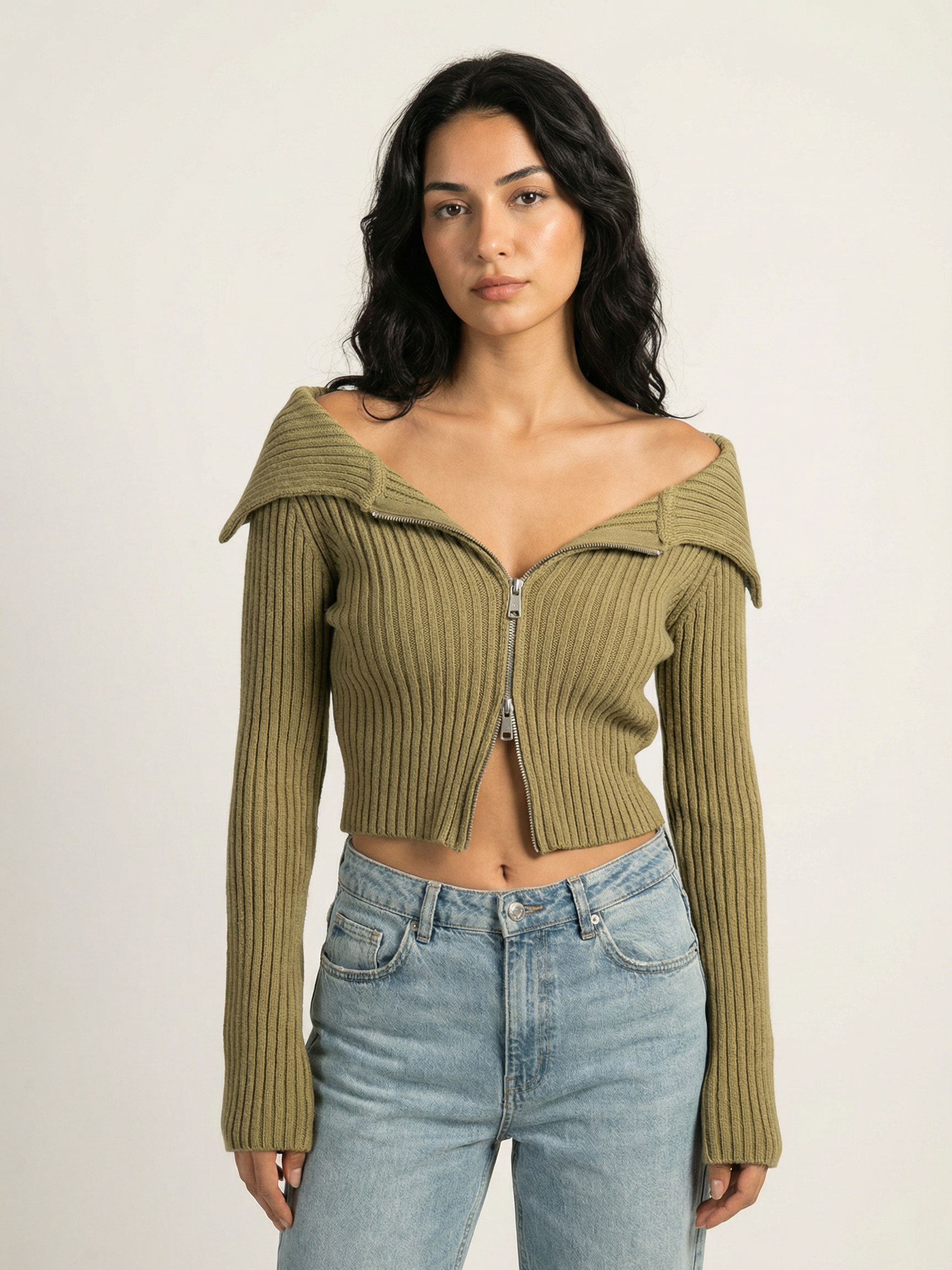 Acı Kahve Kayık Yaka Çift Fermuarlı Triko Hırka