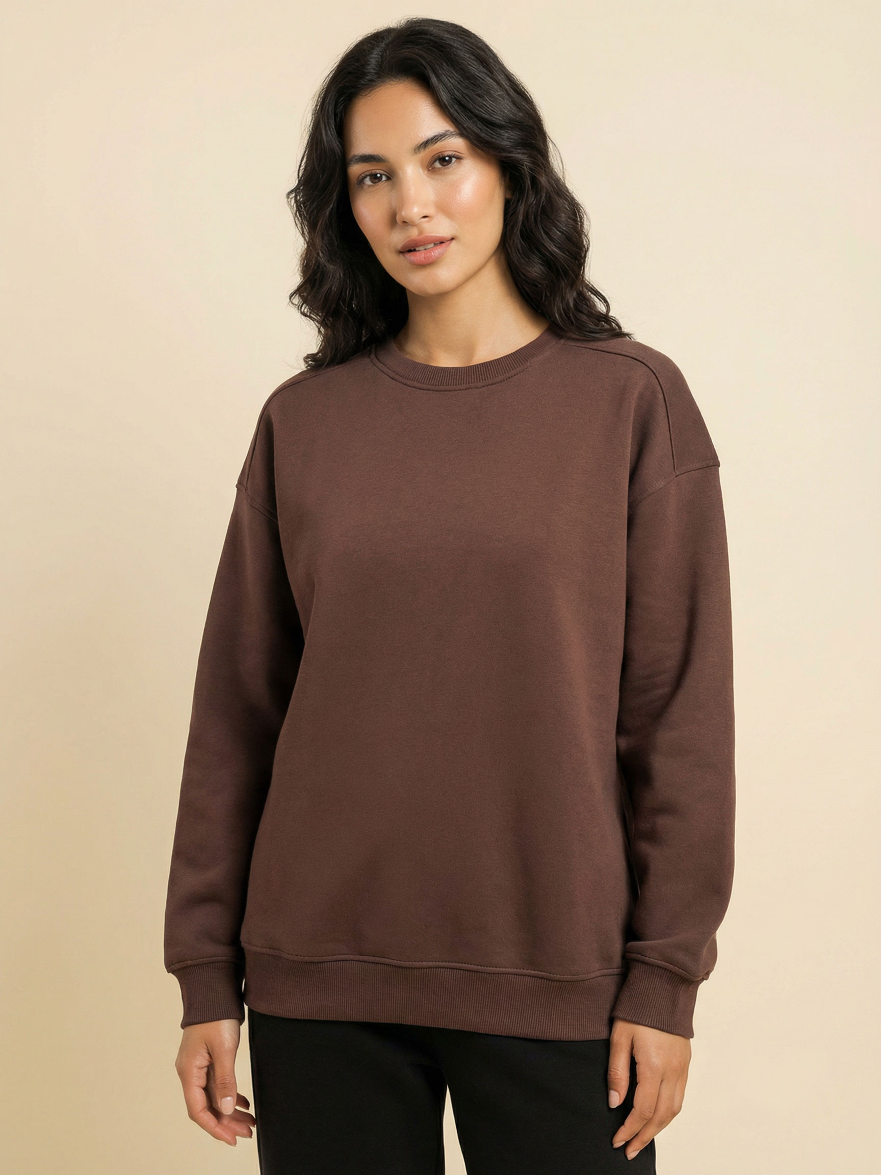 Kahverengi 3 Iplik Basic Bisiklet Yaka Sweatshirt